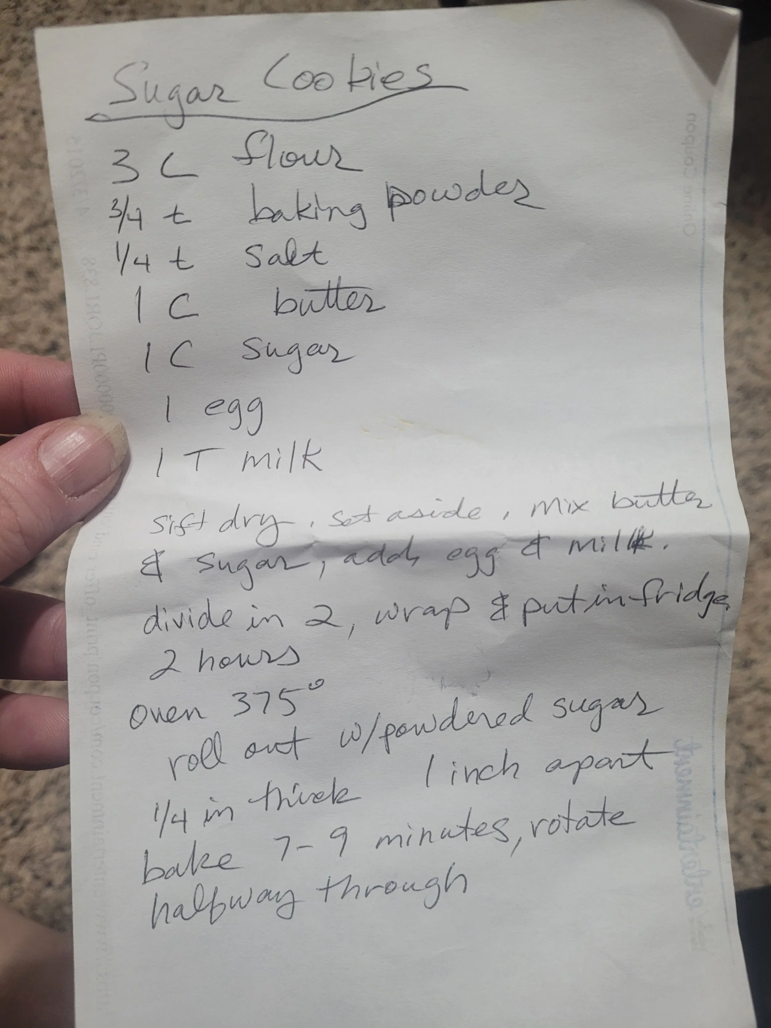 Sift dry, set aside. Mix butter and sugar, add egg and milk. Divide in 2. Wrap and put in fridge 2 hours. Oven 375. Roll out with powdered sugar. 1/4 inch thick. 1 inch apart. Bake 7-9 minutes, rotate halfway through.